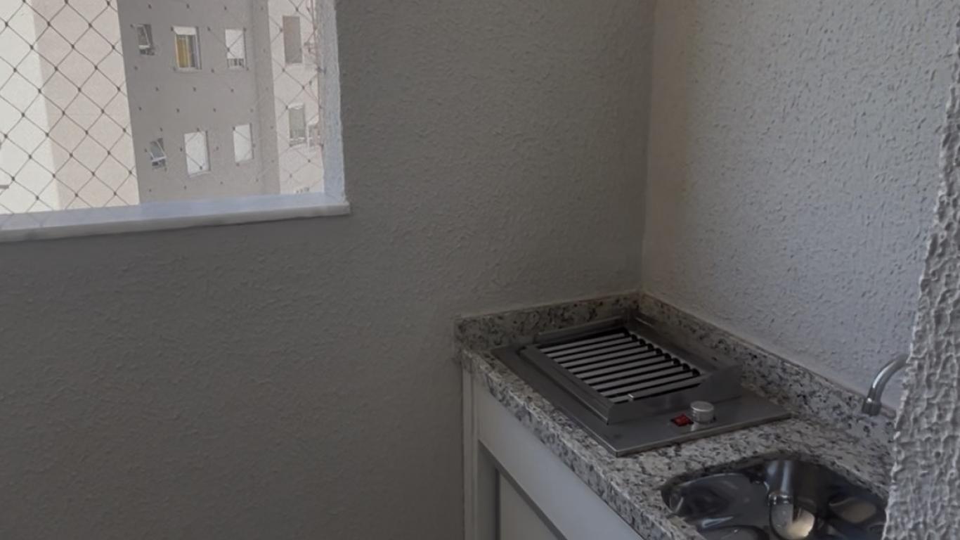 * sacada gourmet com churrasqueira elétrica, gabinete planejado e pia.